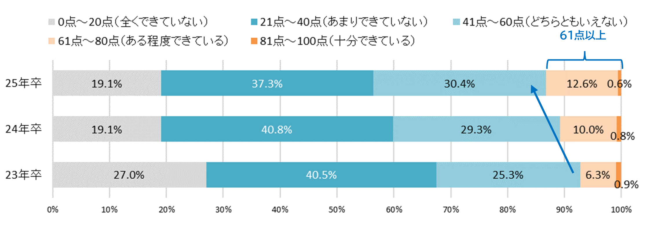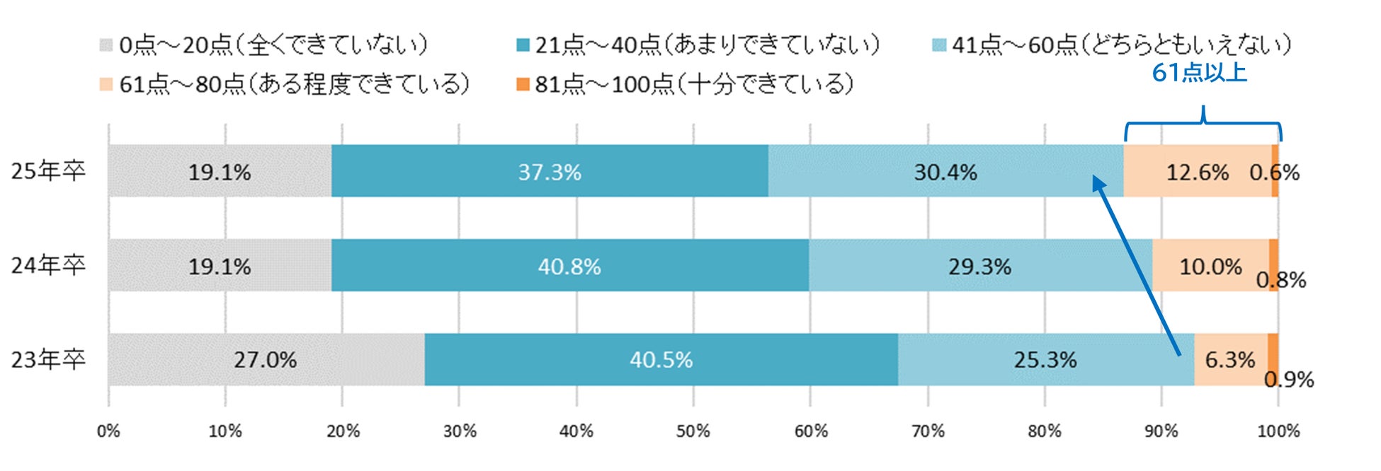 現在の就活準備レベルを100点満点で自己採点すると「21~40点(あまりできていない)」が最多だが、点数は年々上昇傾向に【図5】