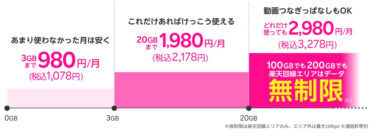 出費が増える年末年始に向けて見直したいのが固定費です。総務省の「携帯電話の料金等に関する利用者の意識」(2021年3月調査)によると携帯料金の平均支出は一人当たり月々約5,824円となりました。ご家族4人が「楽天モバイル」に乗り換えた場合、年間で約122,208円おトクになります。(注9)「楽天モバイル」ではシンプルで分かりやすいプランとサービスを提供しており、料金プランは毎月のデータ量により、金額が変動します。3GBまでは980円/月(税込1,078円)、20GB までは1,980円/月(税込2,178円)20GB超過後はどれだけご利用いただいても2,980円/月(税込3,278円)です(注10)。普段あまりデータを利用しない方は月々のお支払いが自動的に安くなり、自宅で映画を見るなどWi-Fi代わりに毎月100GBや200GBの大容量データを利用しても月々2,980円(税抜)のため、料金を気にせず安心してご利用いただけます。さらに「Rakuten Link」アプリを使うと国内通話は無料です(注11)。また、楽天グループのサービスを使えば使うほど「楽天市場」での買い物でポイントがアップするプログラム「SPU(スーパーポイントアッププログラム)」においては、2022年11月1日(火)から「楽天モバイル」の契約者は最大+3倍に変更になり、「楽天ポイント」の還元率が最大16倍にアップします。 「お買い物マラソン」や「楽天スーパーSALE」などの各種キャンペーンと併用することで、ポイント還元率をさらにアップすることができます。