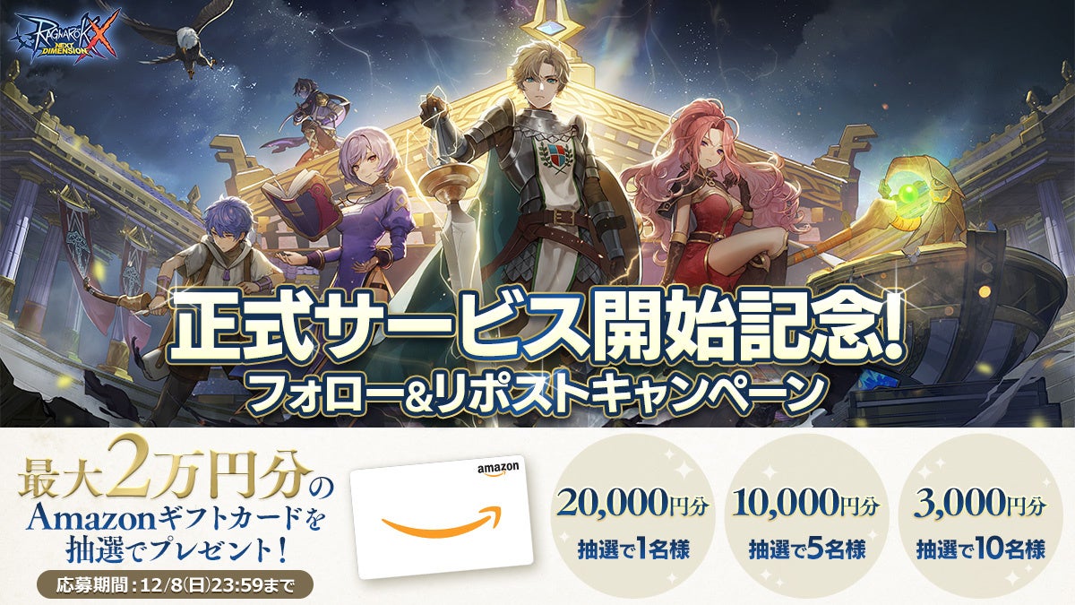 正式サービス開始を記念して、Xにてリポストキャンペーンを実施いたします。『ラグナロクX』の公式Xアカウント(@ragnarokx_jp)をフォローし、キャンペーンハッシュタグが入った対象のポストをリポストしてください。最大2万円分のAmazonギフトカードが抽選で16名様に当たります。まだ『ラグナロクX』公式Xアカウントをフォローしていない方は、この機会にフォローして、キャンペーンにご参加ください。