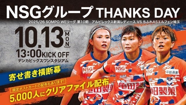 2025年10月4日(土)開催の【アルビレックス新潟 vs ファジアーノ岡山 】および、2025年10月13日(月・祝)開催の【アルビレックス新潟レディース vs ちふれASエルフェン埼玉 】は、「NSGグループサンクスデー」として開催され、両試合において来場者プレゼント企画を実施いたします。