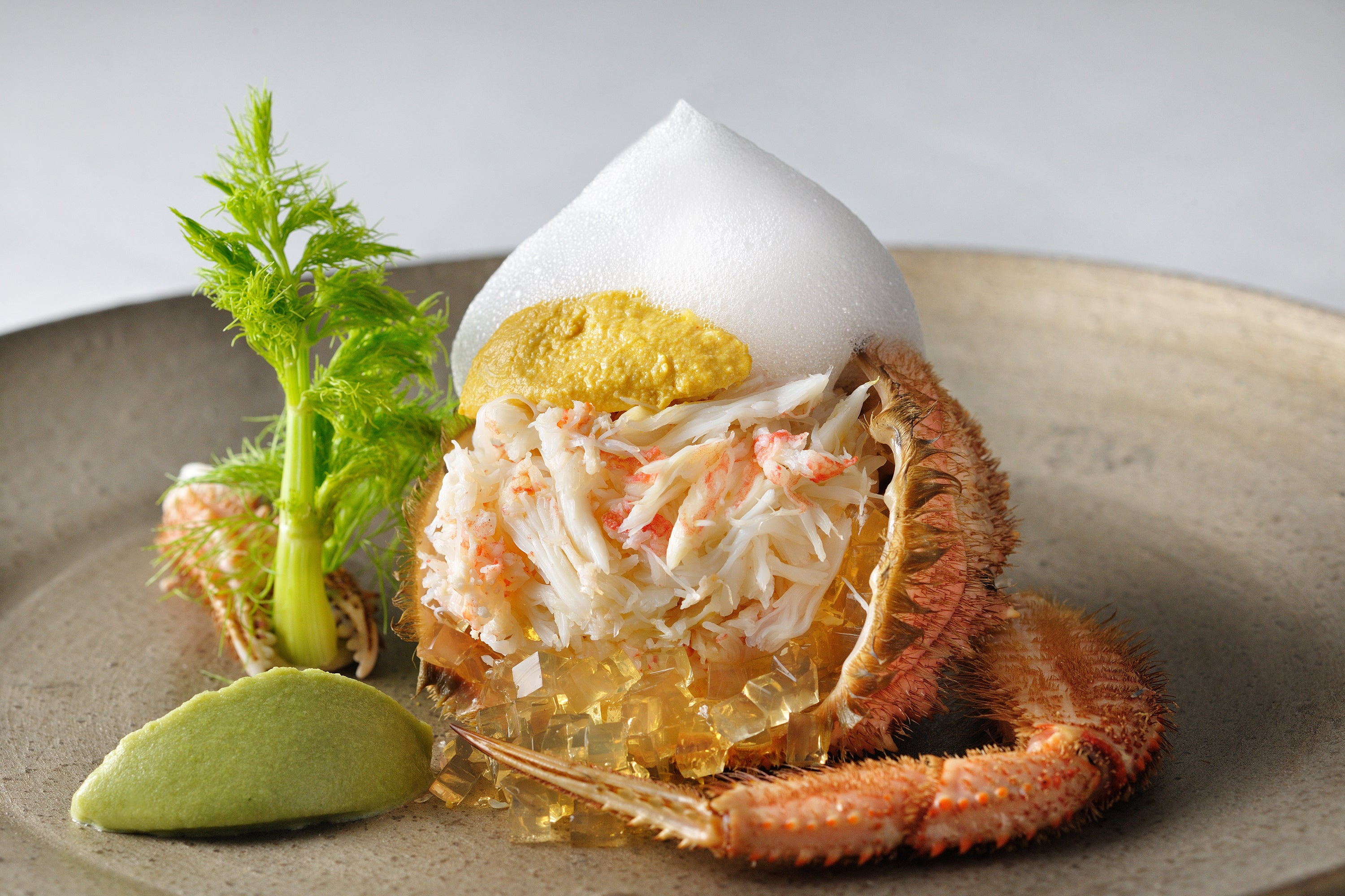 魚料理は、帆立や雲丹のムースを蟹で巻き込み、蒸すことで身をふっくらとさせた「蟹のインボルティーニ(*4)」です。器に広がるバジルと春菊に、目の前で熱々のオリーブオイルをかけると、パチパチとはじける音と清涼感のある香りが立ち上り、五感を刺激する瞬間を生み出します。口いっぱいに広がる、ふっくらと蒸された蟹の身のしっかりとした旨みを楽しめます。蟹や魚介の旨みがつまったクリアなスープを合わせることで、この贅沢な味わいを一層引き立てる一皿です。