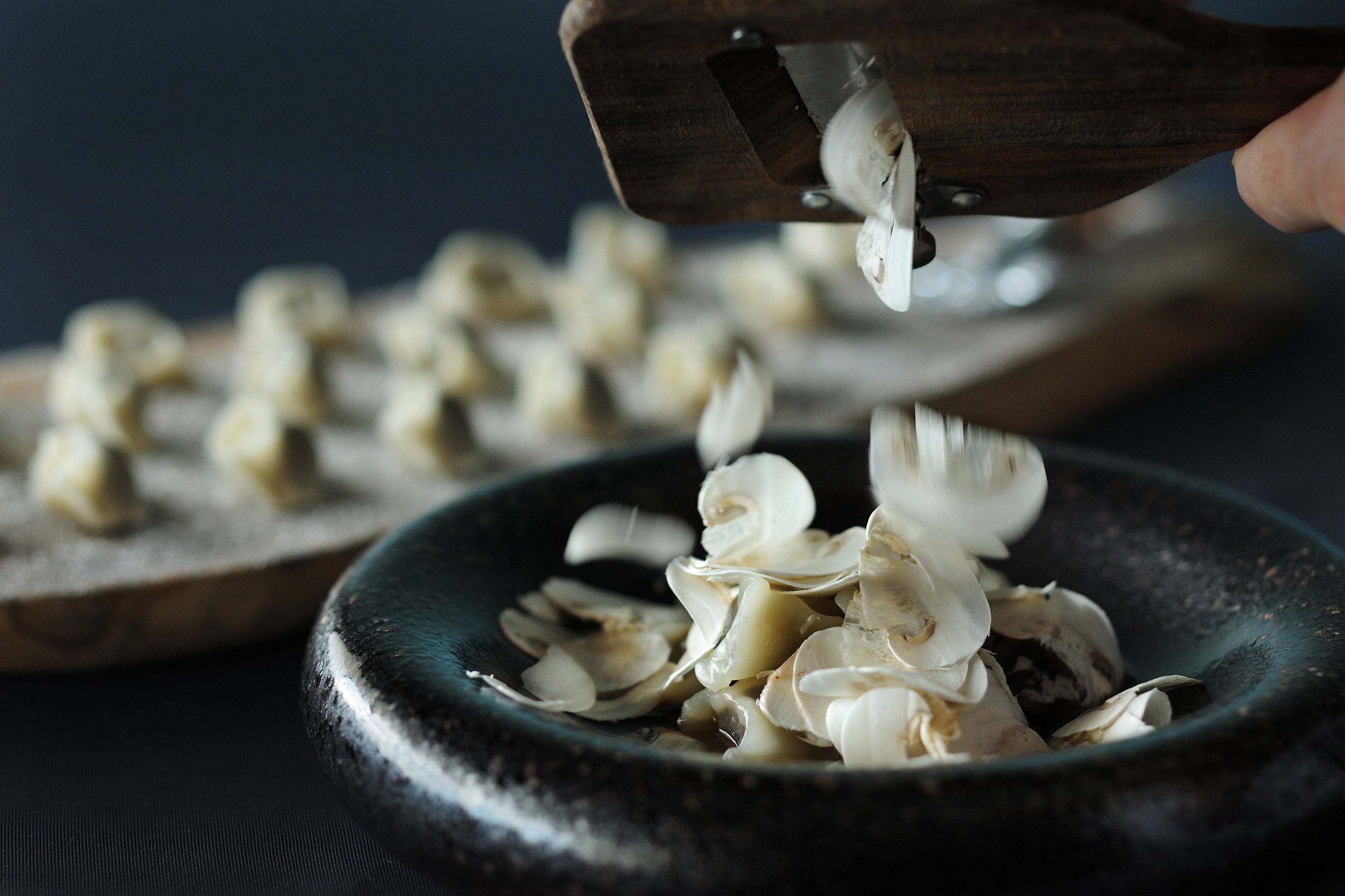 コースの始まりを彩る小前菜は、海と大地からの恵みを凝縮した華やかな4種類の料理です。コルノは、爽やかなレモンや香草の香りを合わせたサーモンのパテを詰め、イクラをふんだんに盛りつけました。パッパコルポモドーロ(*2)は、クリアなトマトジュレの上に、濃厚な雲丹を添えました。澄んだトマトの酸味と、雲丹の甘くまろやかな風味が絶妙なハーモニーを生み出します。これらの料理は、北海道を代表する白樺の木でできた器の上に並べられます。肉や魚、野菜などさまざまな食材を使用している前菜を、白樺の器の風合いが北海道の広大な大地を思わせる豊かさで包み込みます。