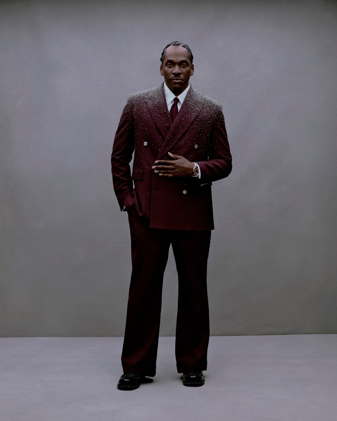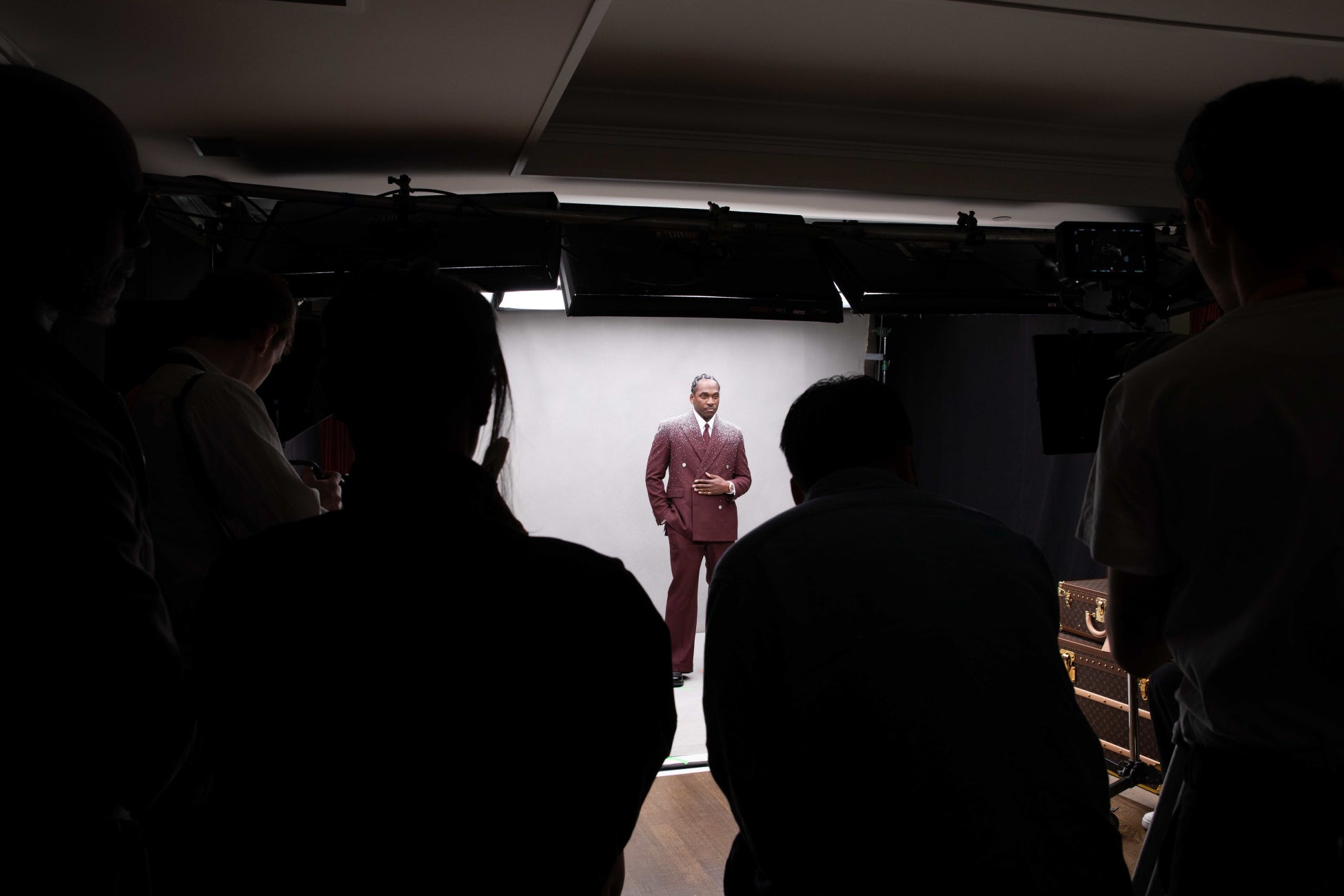 オーダーメイドのスーツは、バーガンディのピンストライプウールジャカードを立体的なテクスチャーで織り上げたダブルブレストブレザーとフレアパンツで構成されています。ジャケットのショルダーパネルにはグラデーションの手刺繍クリスタルがあしらわれ、ボタンにはパールが埋め込まれています。また、ホワイトのポプリンドレスシャツと、バーガンディのテクスチャードシルクネクタイを合わせ、足元にはブラックレザーのメタルスタッズ付き「LV オックスフォードブローグ」をコーディネートしました。