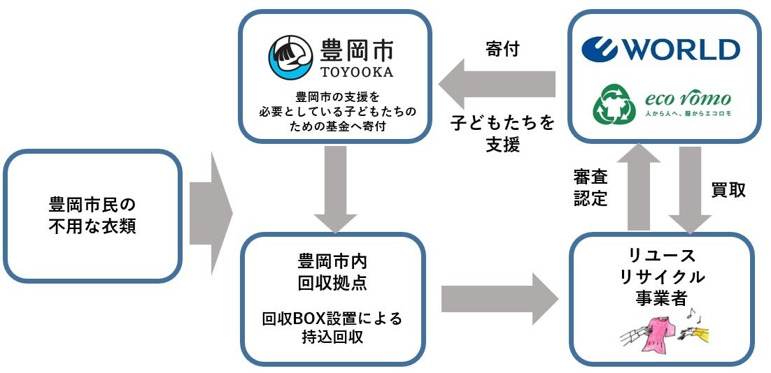 兵庫県(環境部環境整備課)と豊岡市、株式会社ワールド(本社:神戸市、代表取締役 社長執行役員:鈴木 信輝)は2025年12月1日(月)~2026年3月2日(月)の期間、SDGsの推進を目的とした『エコロモキャンペーンin豊岡』を行います。豊岡市とワールドのSDGsに伴う取り組みは初となり、回収した衣類をリユース・リサイクルすることで得た収益金は、豊岡市の支援を必要としている子どもたちのための基金へ寄付いたします。今回の取り組みを通じて、地域社会と環境に貢献しながら、持続可能な未来の実現を目指してまいります。