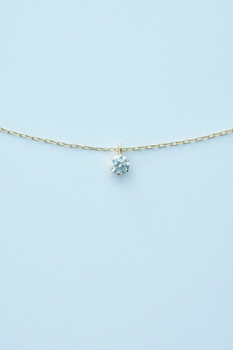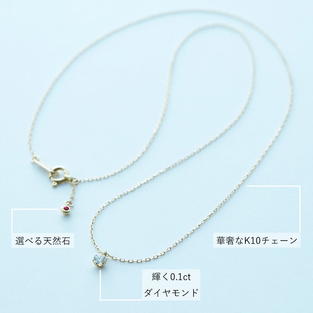 輝く0.1ctのダイヤモンドと華奢なK10のゴールドチェーンは、素肌にそっと寄り添うため、合わせる服やシーンを選ばないのも魅力です。留め具の天然カラーストーンが可愛らしいアクセントにもなっています。