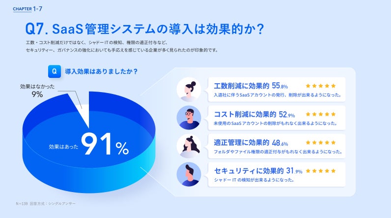 SaaS管理システムを導入する企業においてシステムの導入が効果的であったかとの問いに対して、91%が「効果はあった」と回答しました。