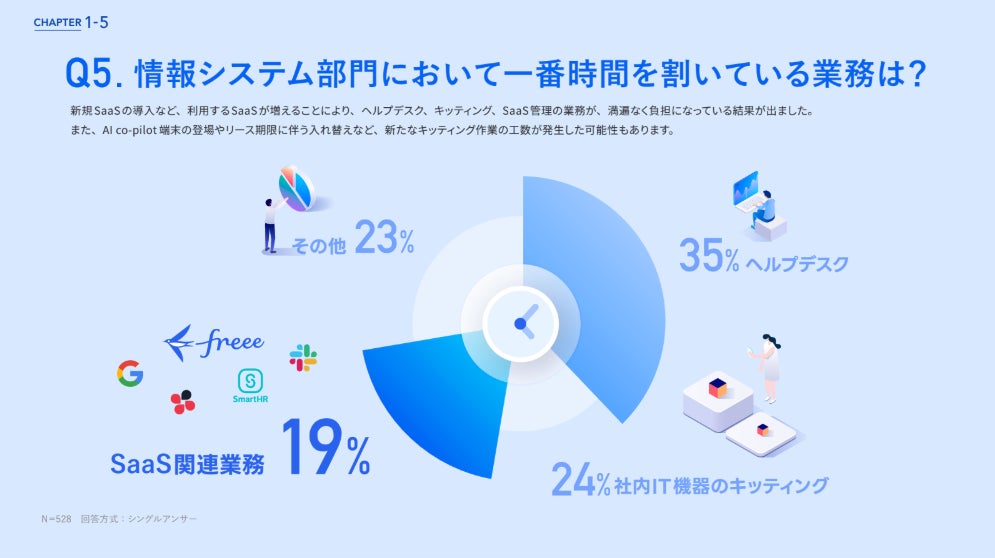 上段の設問でSaaSの利用数が増加している状況が明らかになりましたが、それに伴い、情報システム部門では業務時間の約2割をSaaS関連業務に費やすなど、その管理が大きな負担となっている実態が判明しました。
