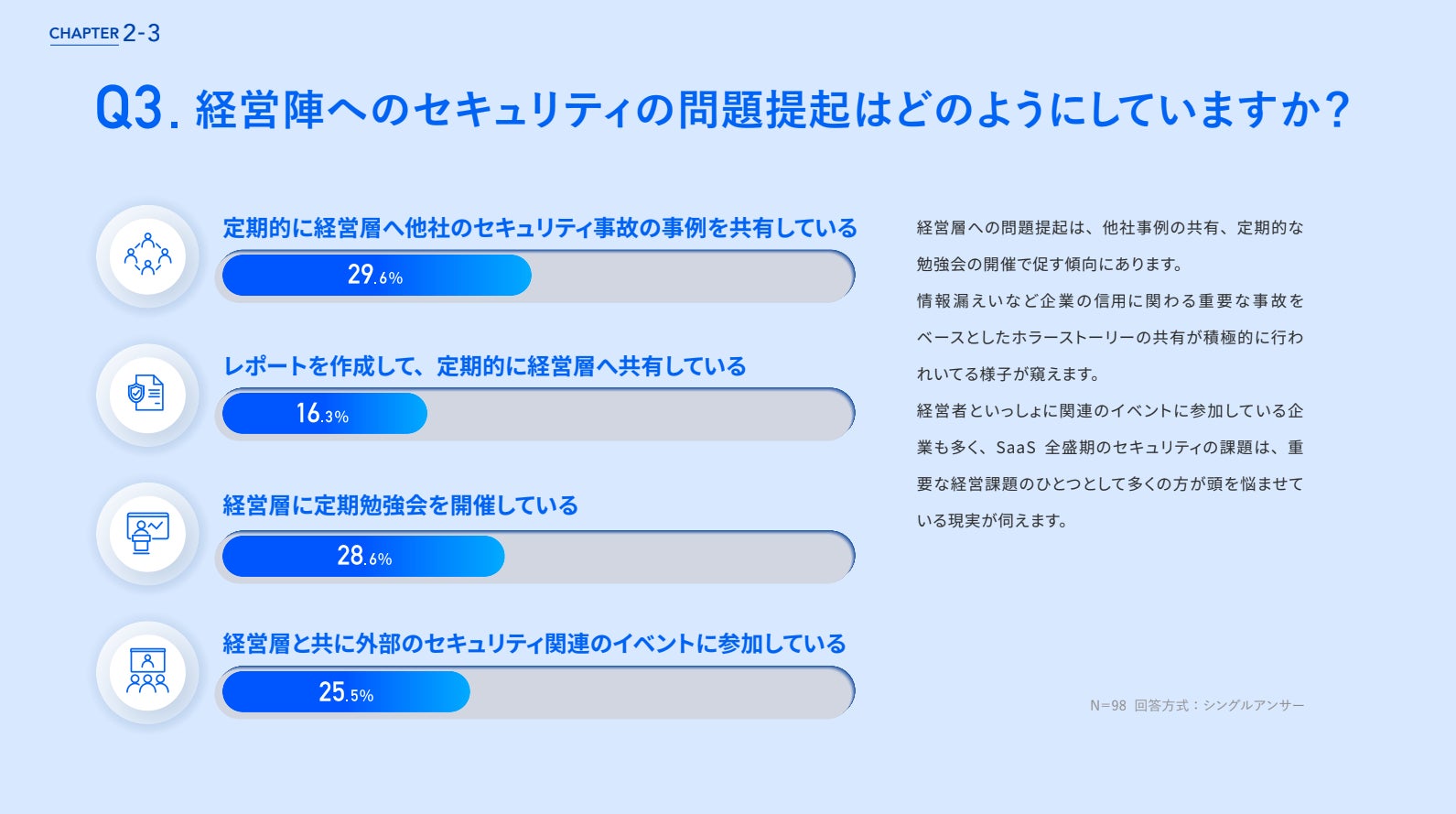 情報漏洩など企業の信用に関わる重要な事故をベースとしたインシデント対応談の共有が積極的に行われていることと、経営者とともにに関連のイベントに参加している企業も多く、SaaS全盛期のセキュリティの課題は、重要な経営課題のひとつとして多くの方が頭を悩ませている現実が伺えます。