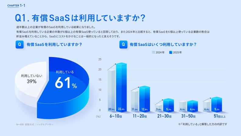 有償のSaaSを利用している企業は61%を占め、有償SaaSを利用している企業のうち半数が6個以上の有償SaaSを利用していると回答しました。