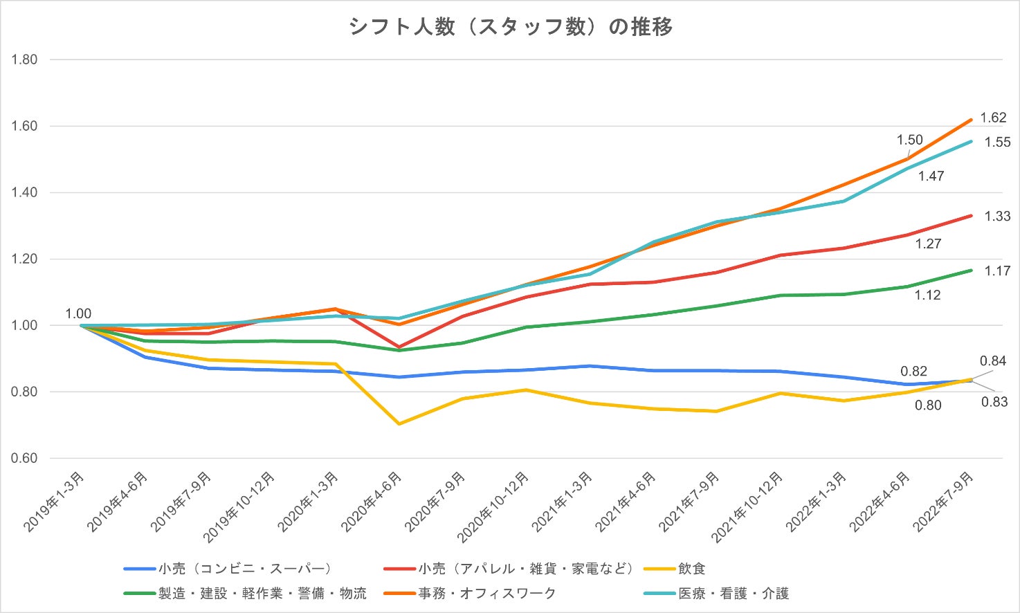 「小売(コンビニ・スーパー)」「小売(アパレル・雑貨・家電など)」「飲食」「製造・建設・軽作業・警備・物流」「事務・オフィスワーク」「医療・看護・介護」の6業種における、新型コロナウイルスの感染拡大前の2019年1月から2022年9月までの推移データを発表致します。