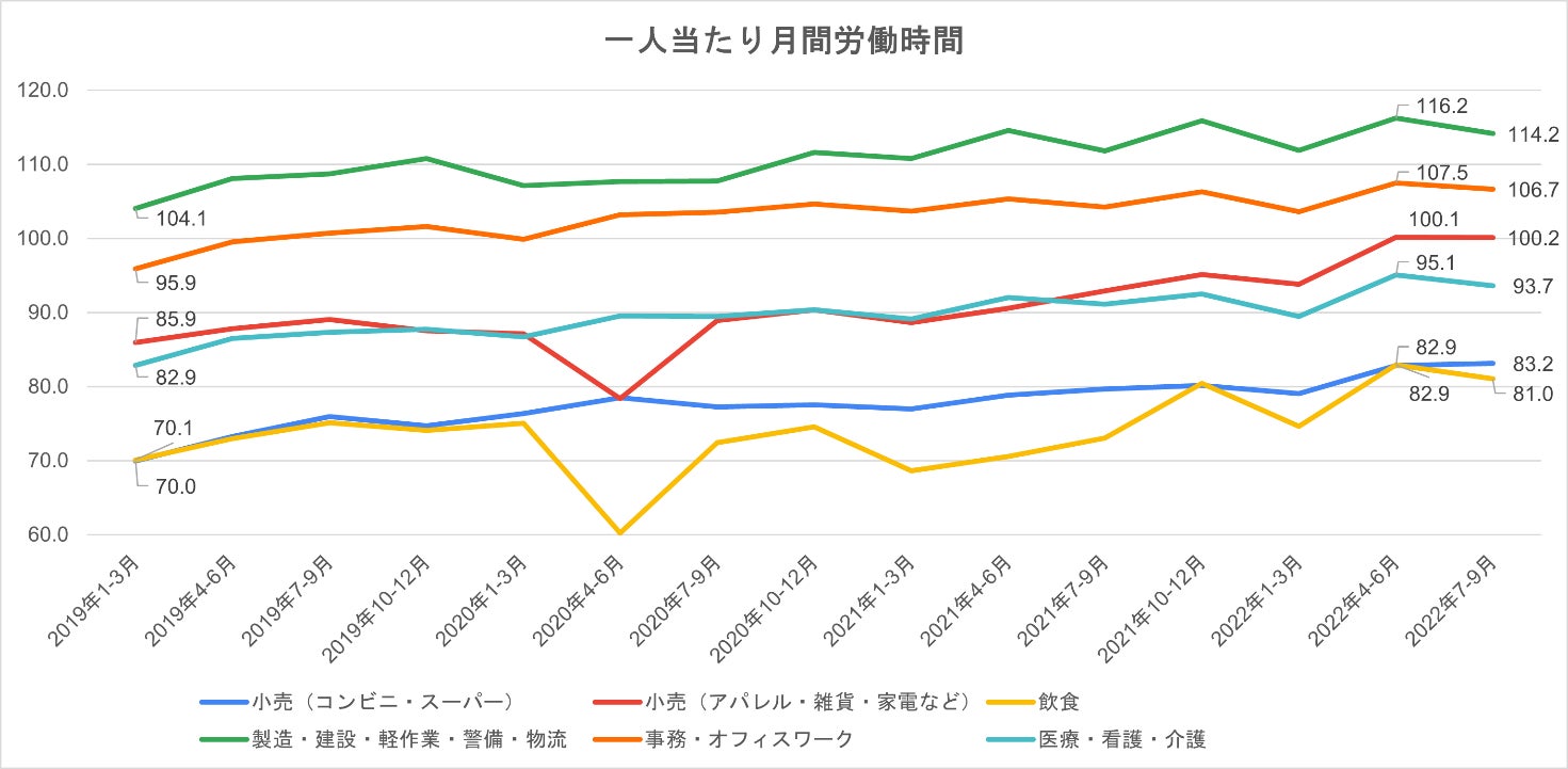 ■2022年7-9月の一人当たり月間労働時間の推移(単位:時間)
