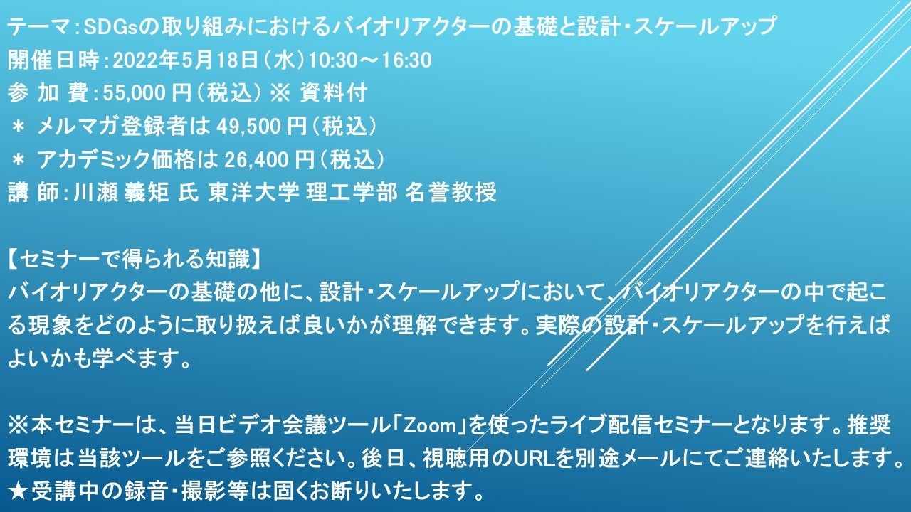 先端技術情報や市場情報を提供している(株)シーエムシー・リサーチ(千代田区神田錦町: https://cmcre.com/ )では、 各種材料・化学品などの市場動向・技術動向のセミナーや書籍発行を行っておりますが、 このたび「SDGsの取り組みにおけるバイオリアクターの基礎と設計・スケールアップ」と題するセミナーを、 講師に川瀬 義矩 氏 東洋大学 理工学部 名誉教授)をお迎えし、2022年5月18日(水)10:30より、 ZOOMを利用したライブ配信で開催いたします。 受講料は、 一般:55,000 円(税込)、 弊社メルマガ会員:49,500 円(税込)、 アカデミック価格は26,400 円(税込)となっております(資料付)。
