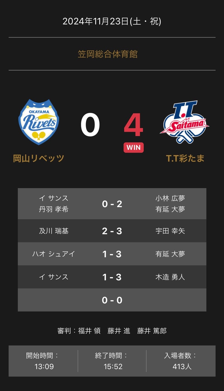 ノジマTリーグ 2024-2025シーズン 公式戦 11月23日開催 「岡山リベッツ vs T.T彩たま」の試合は、4-0でT.T彩たまが勝利しました。