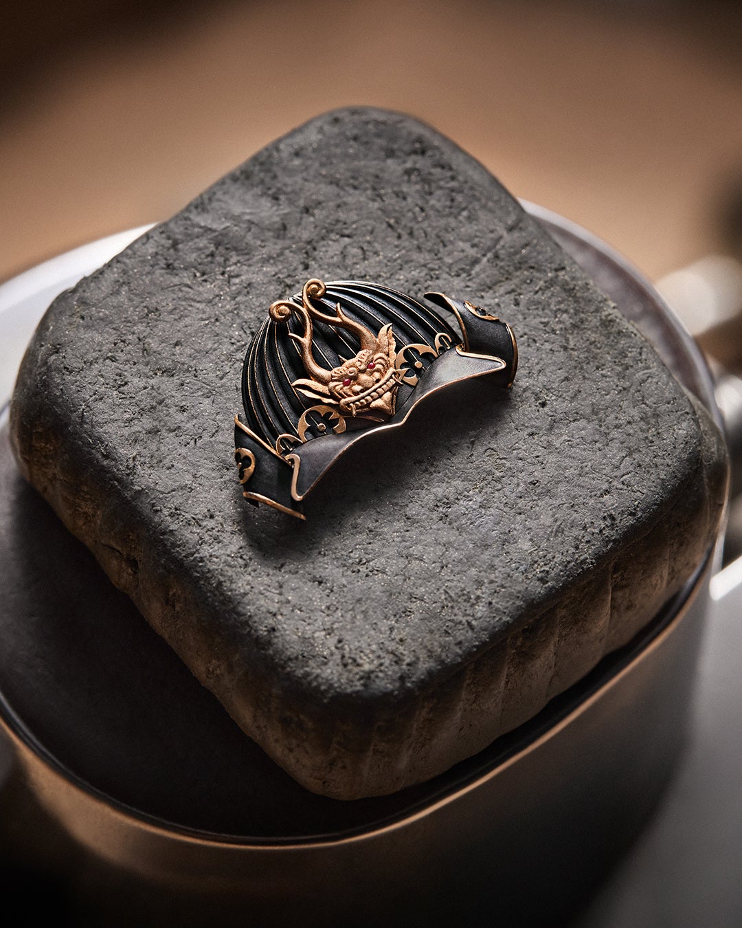 ダイアルの各要素は、職人たちに自身の技術を駆使する真の実験と革新を促し、「タンブール ブシドウ·オートマタ」を精緻な表現のキャンバスへと変貌させました。その結果、ディテール、立体感、そして好奇心を掻き立てるダイアルが誕生し、同時にサムライの独特の感情とダイナミズムを捉えています。例えば、兜は頭部を保護するために使用される鎧の一部ですが、サムライ個々のアイデンティティと地位の象徴でもあります。このシンボリズムに命を与えたのが、マスター·エングレーバーのディック·スティーンマンと彼のチーム。まずローズゴールドの兜を彫金し、その後、カラミン技法を用いて高温で焼成。これにより、焦げたような仕上がりの薄い炭化物層が形成され、その後手作業による再加工を経て、下地の黄金色が輝きを放つように仕上げられます。