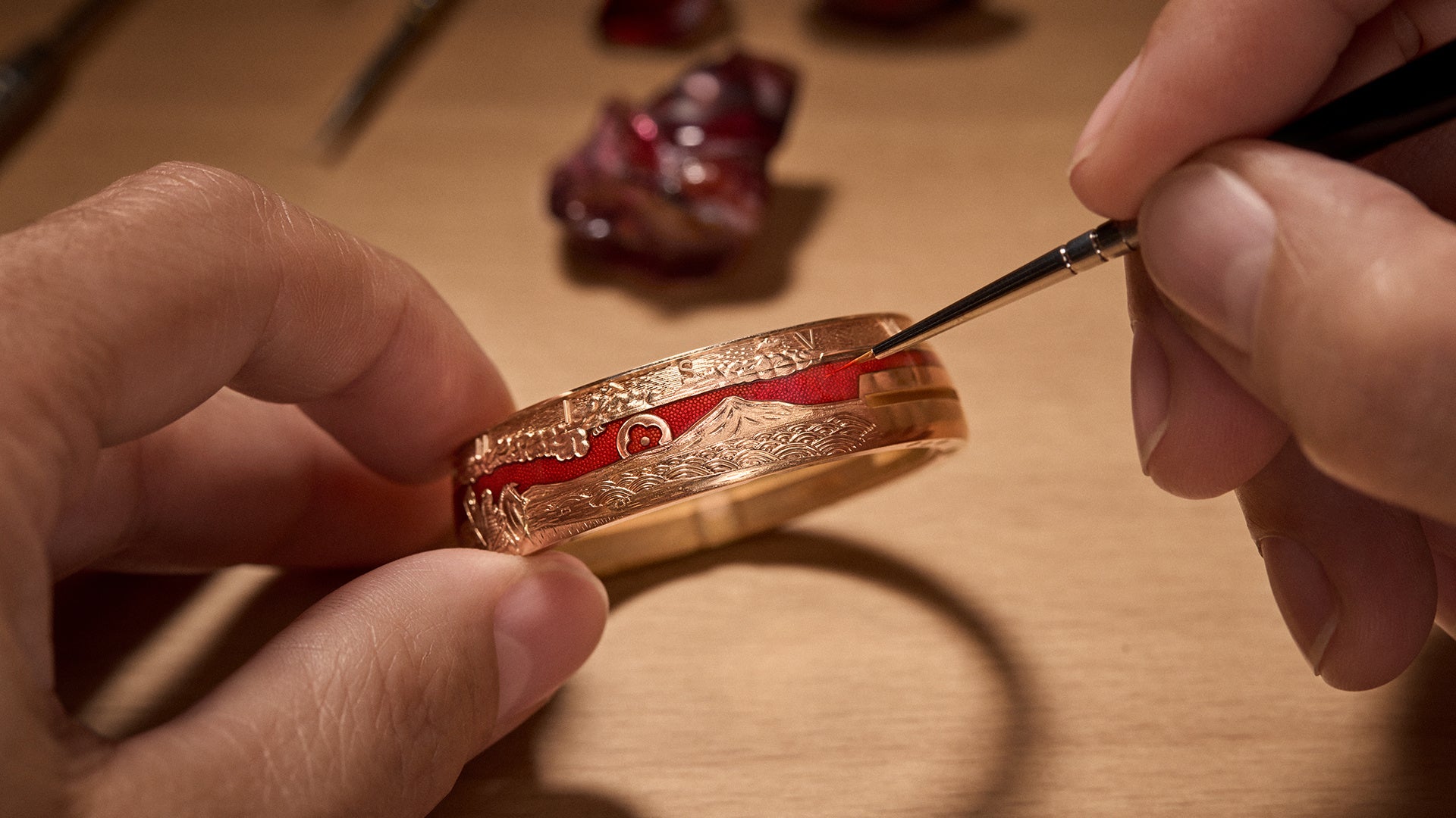 彫刻芸術と並行して進められたのが革新的なエナメル加工です。「ラ·ファブリク·デ·ザール」が新たな技術とイノベーションを大胆に試行錯誤し、最終的に約120時間に及ぶ作業を経て完成させました。職人たちは、「タンブール カルペ·ディエム·オートマタ」と「タンブール オペラ·オートマタ」で培ったノウハウを駆使し、自身の技術をさらに豊かに磨き上げるという難題に挑戦。鮮やかな色合いと立体感を維持したまま、極薄の面を実現するための超薄型加工技術の開発に成功しました。