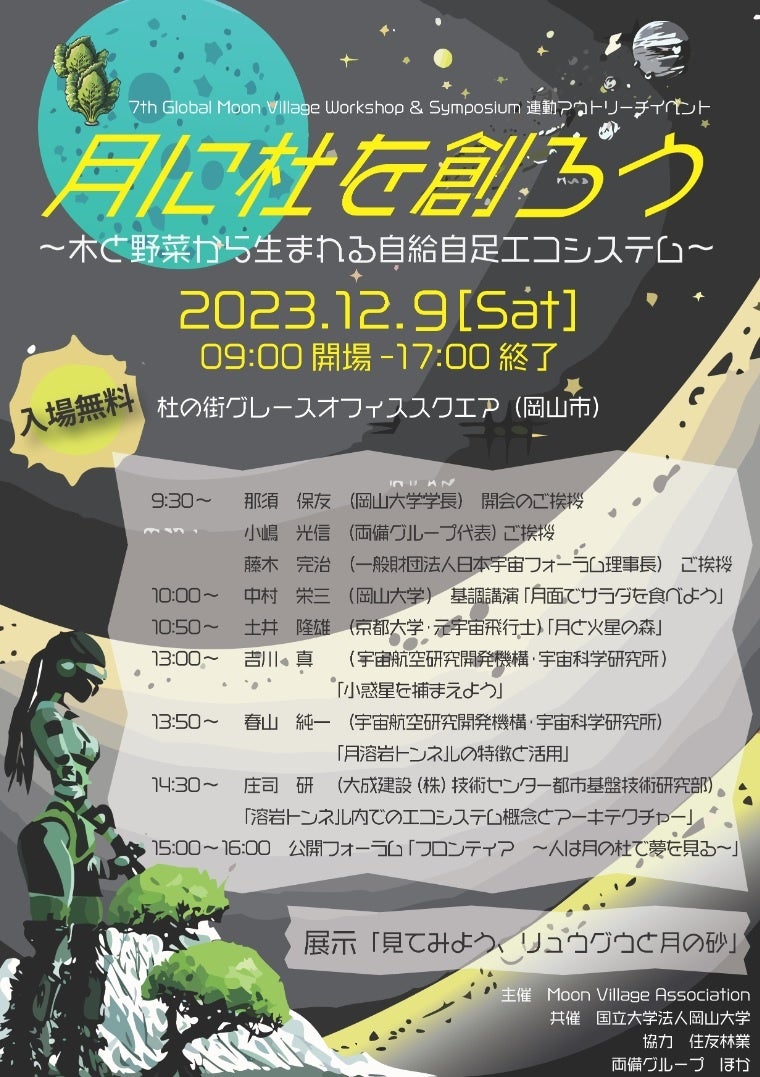国立大学法人岡山大学(本部:岡山市北区、学長:那須保友)では、7th Global Moon Village Workshop & Symposiumに連動し、「月に杜を創ろう」というテーマで、一般の方を対象としたイベントを2023年12月9日(土)に杜の街グレースで開催します。
