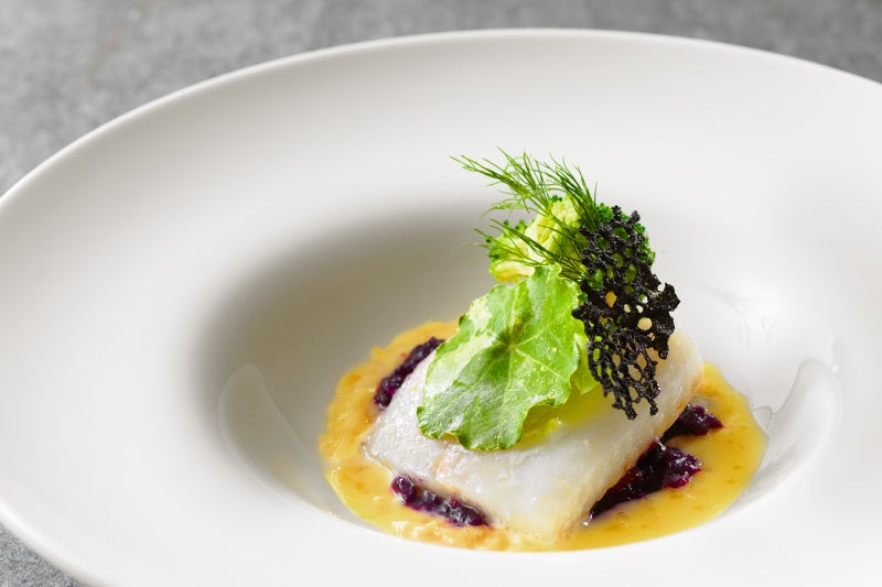 日高産の肉厚な鮫カレイを低温調理でふっくらと焼き、夏に旬を迎えるラベンダーの香りを纏わせた華やかな一品。(7月限定ディナーアラカルト 提供時間 15:00-21:00)