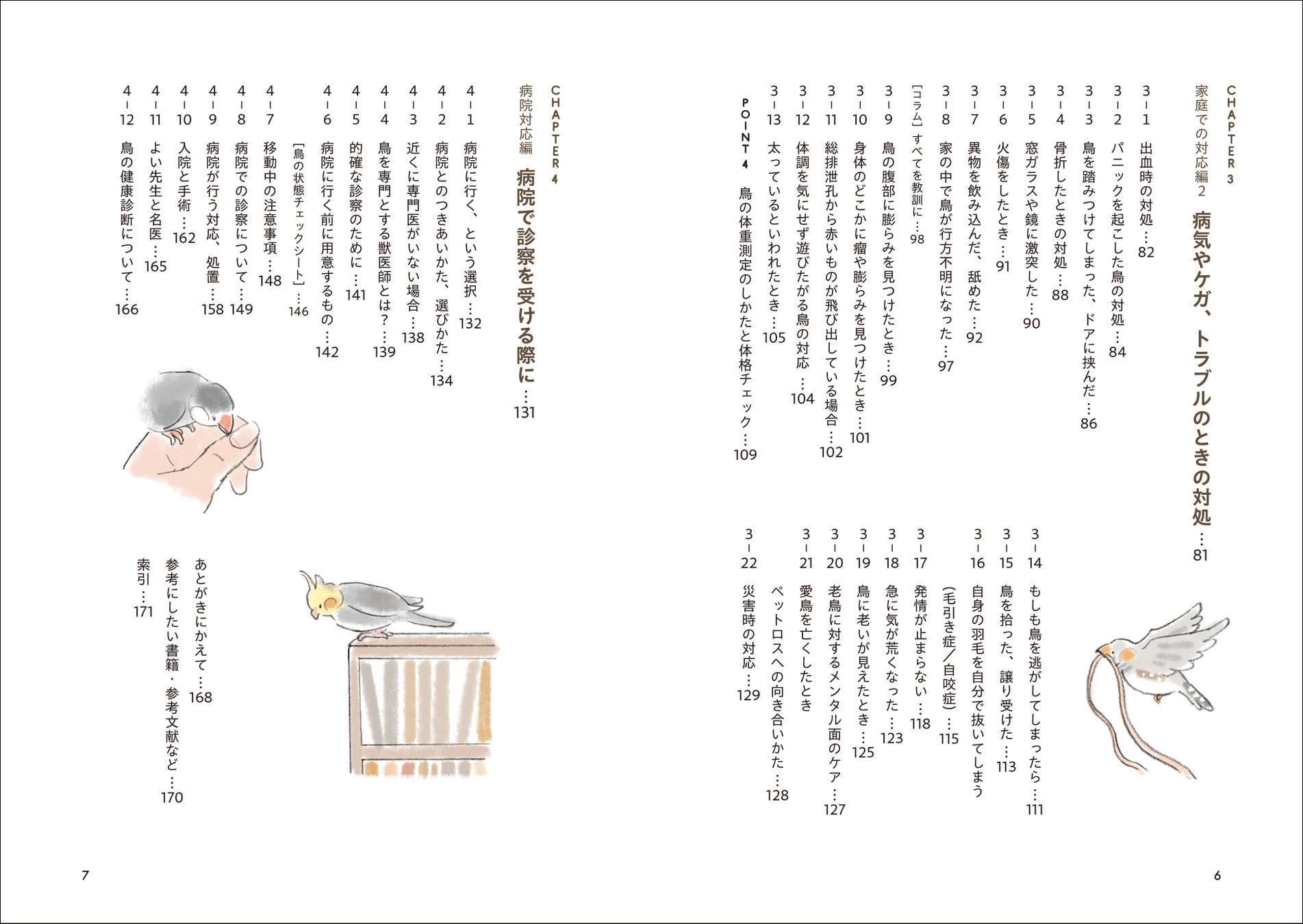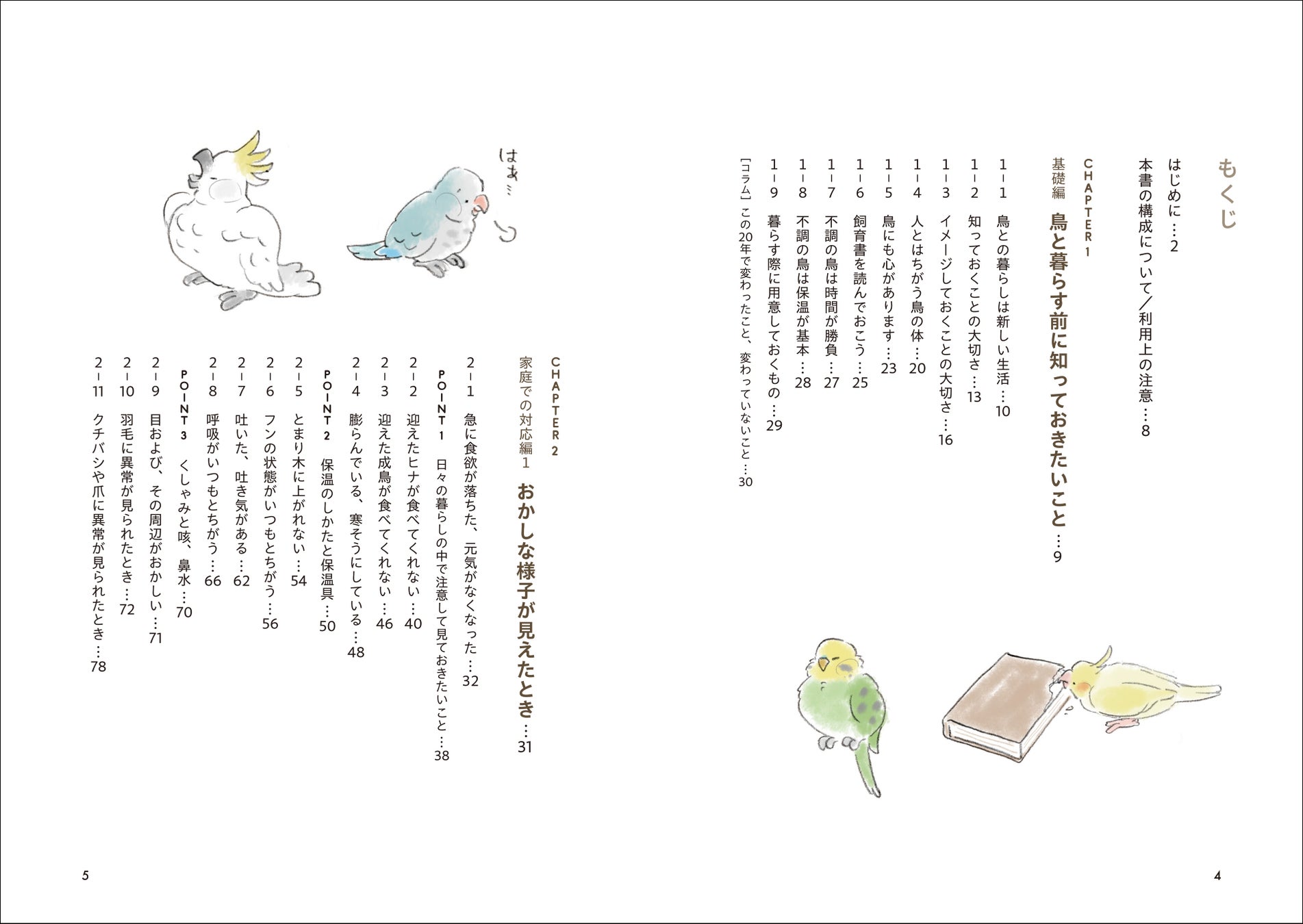 鳥と暮らす前に知っておいたほうがよいことや、愛鳥に普段と違うおかしな様子が見えたとき、病気やケガ、トラブルなどがおこったとき、病院とのつきあいかたや選びかた、病院に行くときに知っておきたいことなど、メンタル面も含めた、困りごとを解決するためのヒントが満載です。