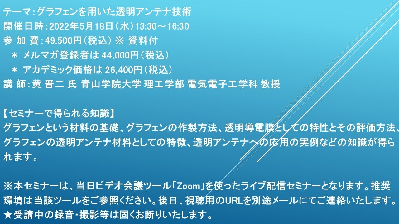 先端技術情報や市場情報を提供している(株)シーエムシー・リサーチ(千代田区神田錦町: https://cmcre.com/ )では、 各種材料・化学品などの市場動向・技術動向のセミナーや書籍発行を行っておりますが、 このたび「グラフェンを用いた透明アンテナ技術」と題するセミナーを、 講師に黄 晋二 氏 青山学院大学 理工学部 電気電子工学科 教授)をお迎えし、2022年5月18日(水)13:30より、 ZOOMを利用したライブ配信で開催いたします。 受講料は、 一般:49,500円(税込)、 弊社メルマガ会員:44,000円(税込)、 アカデミック価格は26,400円(税込)となっております(資料付)。
