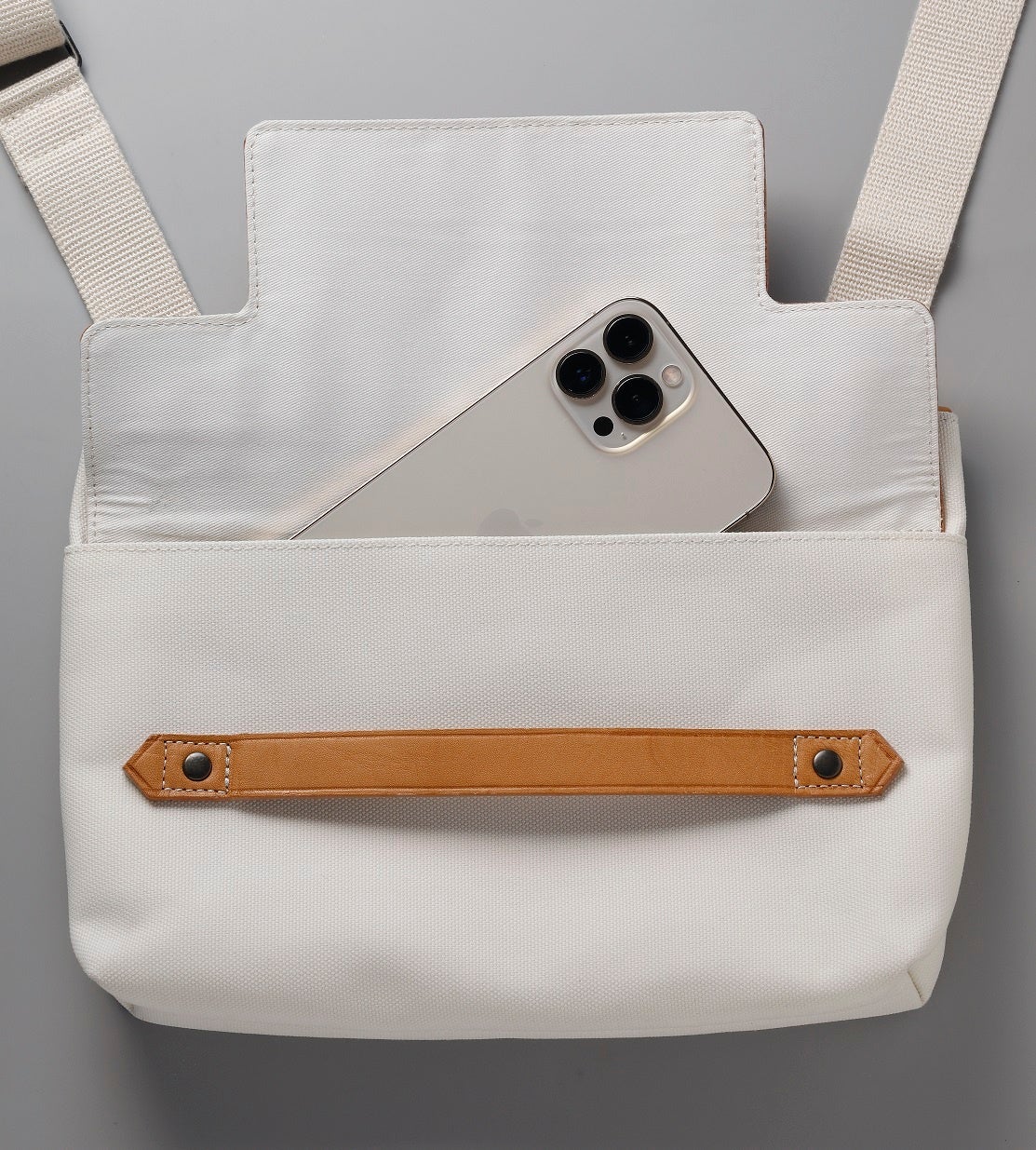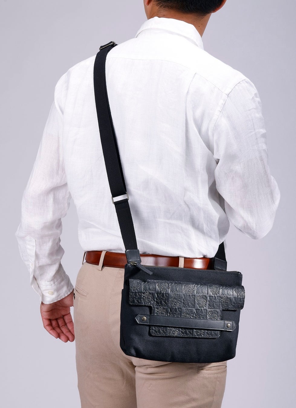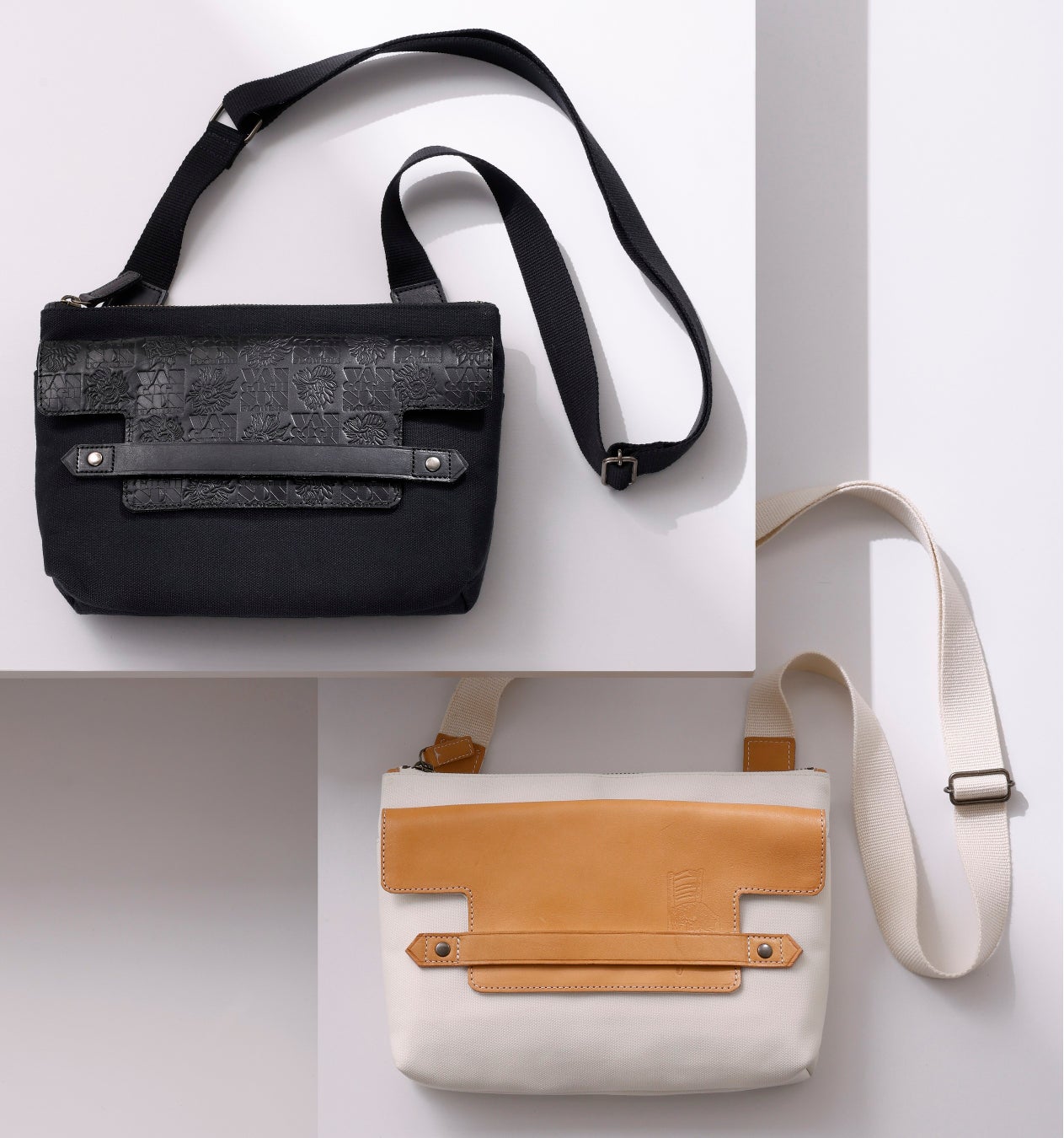 本革とキャンバス地の共演にファン・ゴッホの名作を添えたショルダーバッグ