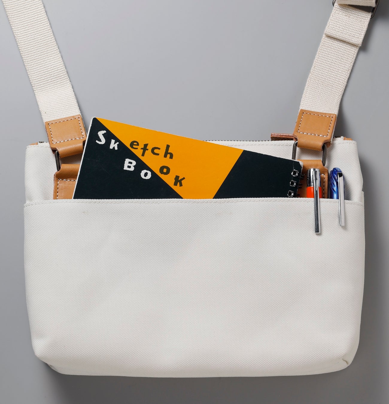 約幅28×マチ5×高さ18cm、約360g。ショルダーベルトの長さ81~143cm(取り外し不可)。ポリエステル、牛革。前面にフラップポケット×1、内側にオープンポケット×1、ファスナーポケット×1、背面にオープンポケット×1。日本製。