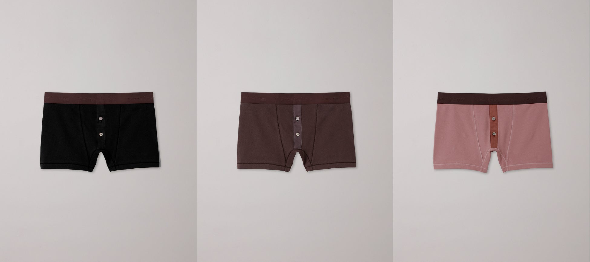 ビターチョコレート(BLK)、ミルクチョコレート(DBRW)、フランボワーズ(ROSE)と、チョコレートを連想させる3色展開のボクサートランクスは、フロント部分の布帛切り替えとデザインボタンがポイント。