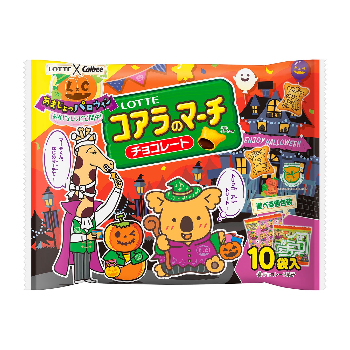 - ロッテの「コアラのマーチくん」とカルビーの「じゃがお」がコラボした、ハロウィン限定デザインのコアラのマーチです。