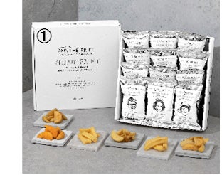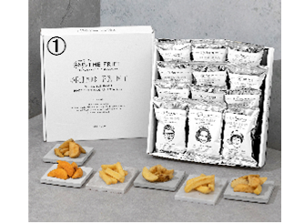 ①シンプルデザインの化粧箱を開けると思わず笑顔になるユーモアのあるパッケージ。丁寧に作られたドライフリットが6種類入って、芋のカットとフレーバーを食べ比べることができます。プレゼントにも最適なプレミアムスナック。食感やフレーバーの違いを、お楽しみください。