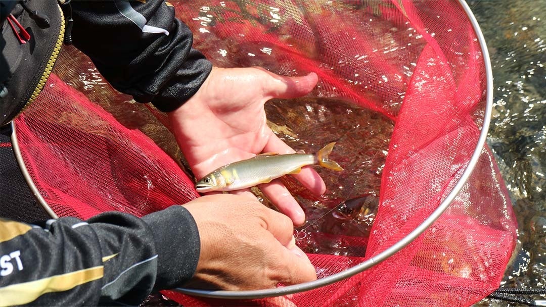チャラ瀬を中心に繊細な泳がせ釣りを展開する谷口に対し、北村はやや流れが絞られた瀬での引き釣り泳がせを選択。また谷口が、掛かれば確実に取るための大鈎使用に対し、アユに負担をかけず確実に掛けるための小鈎で挑む北村。両者ともに違うアプローチでスタートした今回のアユ釣りだが、結果的には両者ともに爆釣モードを展開。アユ釣りのアプローチは一つではないと言うことを証明。これから迎える終盤のアユ釣り、または来期のアユ釣りにおいて、2人それぞれのアプローチ方法は非常に参考となるはず!