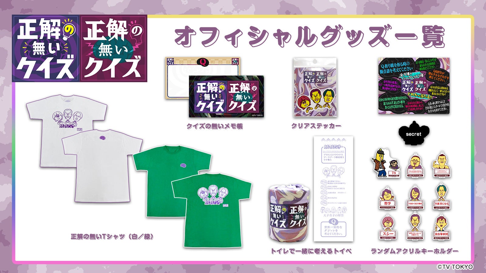8月6日(火)放送の『正解の無いクイズ』番組本編でカルマルアンサーに選ばれた「ランダムアクリルキーホルダー」をはじめ、「本体の色によってデザインが異なるTシャツ」や、「トイレットペーパー」など、多岐にわたるアイテムを販売いたします。