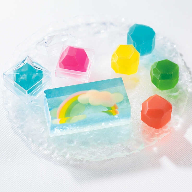 夏の青空に架かる虹を錦玉製三層細工羊羹で表現した「虹ノ空」と、マスカット、アプリコット、レモン、マンゴー、ソルトの夏らしいフレーバーで花火をモチーフにした5色の干琥珀。熟練した職人の手仕事が生み出す繊細な味わいです。