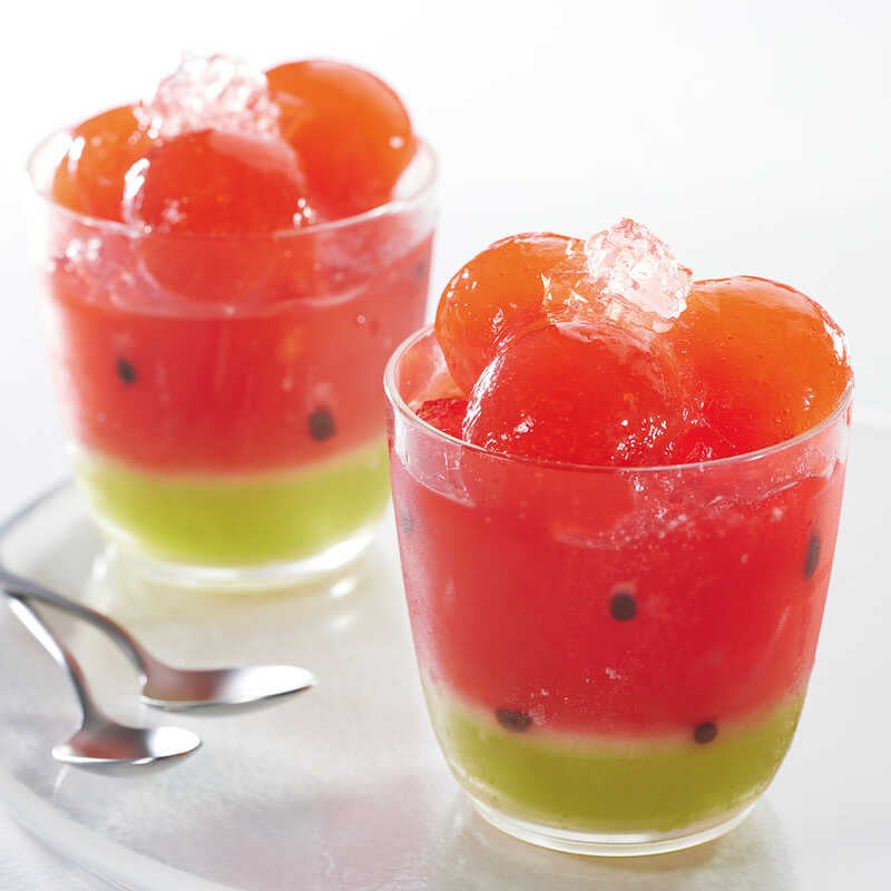 可愛いルックスにときめく、存在感抜群のビジュアル系ゼリー。すいかの甘さを引き立てるため、隠し味にりんごのピューレをプラス。皮に見立てたメロンジュレを混ぜて味変するのも◎。