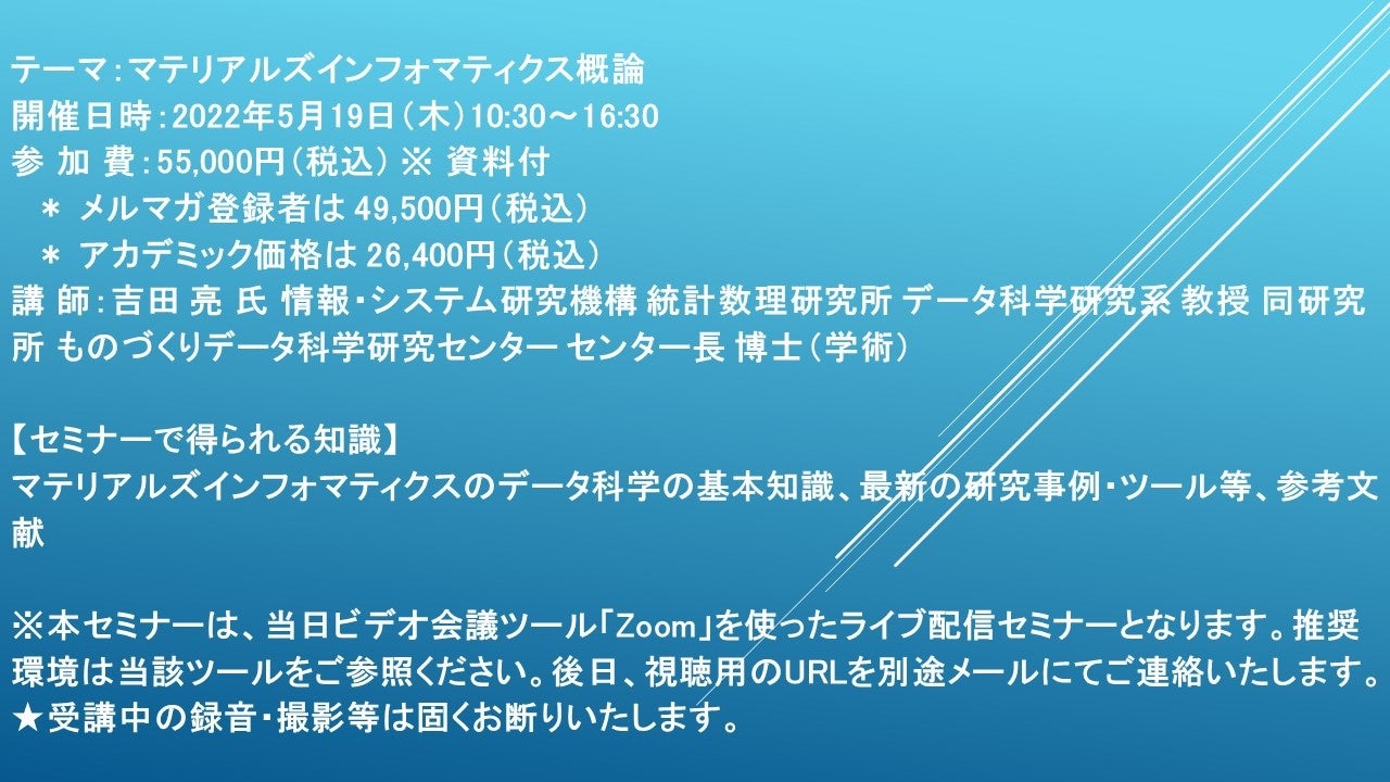 先端技術情報や市場情報を提供している(株)シーエムシー・リサーチ(千代田区神田錦町: https://cmcre.com/ )では、 各種材料・化学品などの市場動向・技術動向のセミナーや書籍発行を行っておりますが、 このたび「マテリアルズインフォマティクス概論」と題するセミナーを、 講師に吉田 亮 氏 情報・システム研究機構 統計数理研究所 データ科学研究系 教授 同研究所 ものづくりデータ科学研究センター センター長 博士(学術))をお迎えし、2022年5月19日(木)10:30より、 ZOOMを利用したライブ配信で開催いたします。 受講料は、 一般:55,000円(税込)、 弊社メルマガ会員:49,500円(税込)、 アカデミック価格は26,400円(税込)となっております(資料付)。
