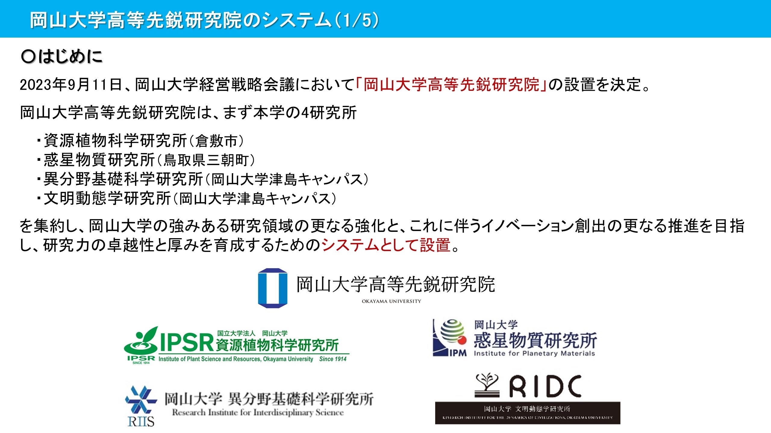 ・【岡山大学】岡山大学高等先鋭研究院を創設~世界と伍す研究・イノベーションの卓越と厚みを育成するシステムを構築~