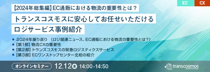 【トランスコスモスオンラインセミナー】【2024年総集編】EC通販における物流の重要性とは?~トランスコスモスに安心してお任せいただけるロジサービス事例紹介~を12/12(木)に開催
