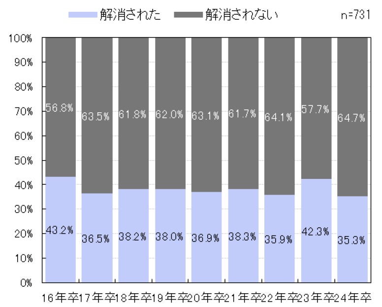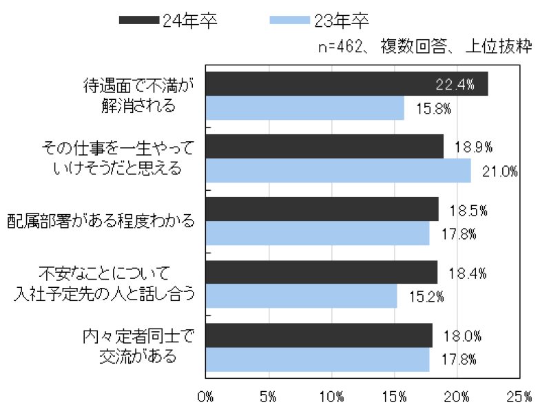 入社予定企業を決めたあとに不安になったことがある学生は前年比0.9pt減の51.0%だった。そのうち不安が解消されていない割合は64.7%で、前年に比べて7.0pt増加した。不安が解消されない学生に「もしこうだったら不安は解消されたこと」を聞いたところ「待遇面で不満が解消される(22.4%)」の割合が前年より6.6pt増加し最も高かった。日本の低賃金や、初任給アップのニュースに影響されてか、自身の入社予定先の待遇面が問題ないか不安を感じる学生が増えたと推察される。【図1、2、3】