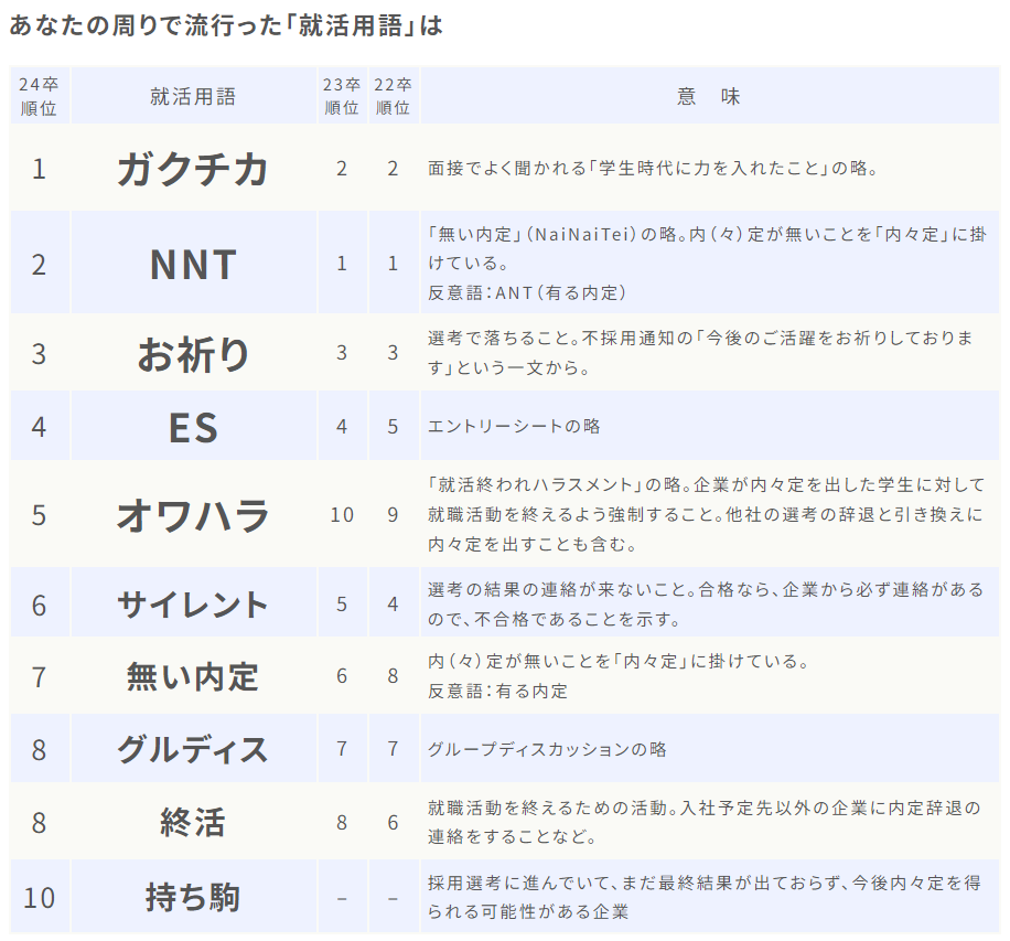 周りで流行った「就活用語」について、今年最も多く挙がったのは「ガクチカ」で19年卒以来5年ぶりの1位となった。24年卒の学生は入学時からコロナ禍で、「ガクチカがない」と話題になったことは記憶に新しい。2位は前年まで3年連続1位の「NNT」(=「無い」内定の略)だった。TOP10に新たに入ったのは、まだ最終選考結果が出ていない企業を指す「持ち駒」だった。ランク外にも「ノーサー、ノーゼミ(サークル・ゼミに無所属の就活生)」「時短就活」など特徴的な言葉が現れている。【図9、10】