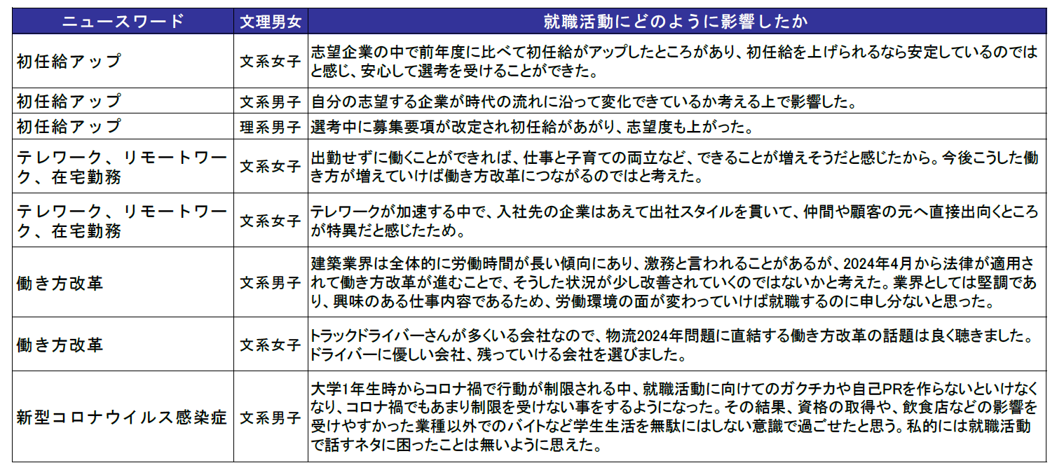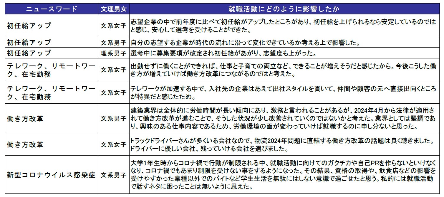 就職活動に影響したニュースワードを聞いたところ、1位は「初任給アップ(22.2%)」。2位は3年連続で「テレワーク、リモートワーク、在宅勤務(20.0%)」、3位は「働き方改革(18.2%)」、4位は前年まで3年連続1位だった「新型コロナウイルス感染症(18.0%)」だった。選んだニュースワードは就職活動にどのように影響したかを自由回答で聞いたところ、企業の安定性や社会変化への順応性を評価する基準として、初任給アップが実現できているかどうかを見ている様子がうかがえた。【図7、8】