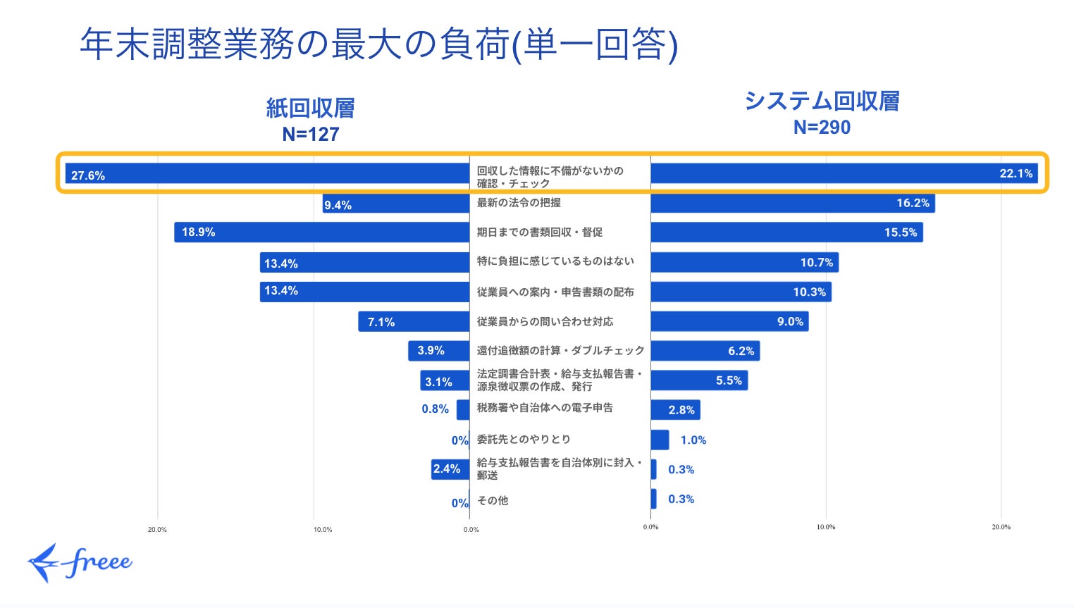 年末調整で特に負担に感じていることは、紙で回収を行う企業・システムで回収を行う企業いずれも「従業員から回収した情報に不備がないかの確認・チェック」であることがわかりました。