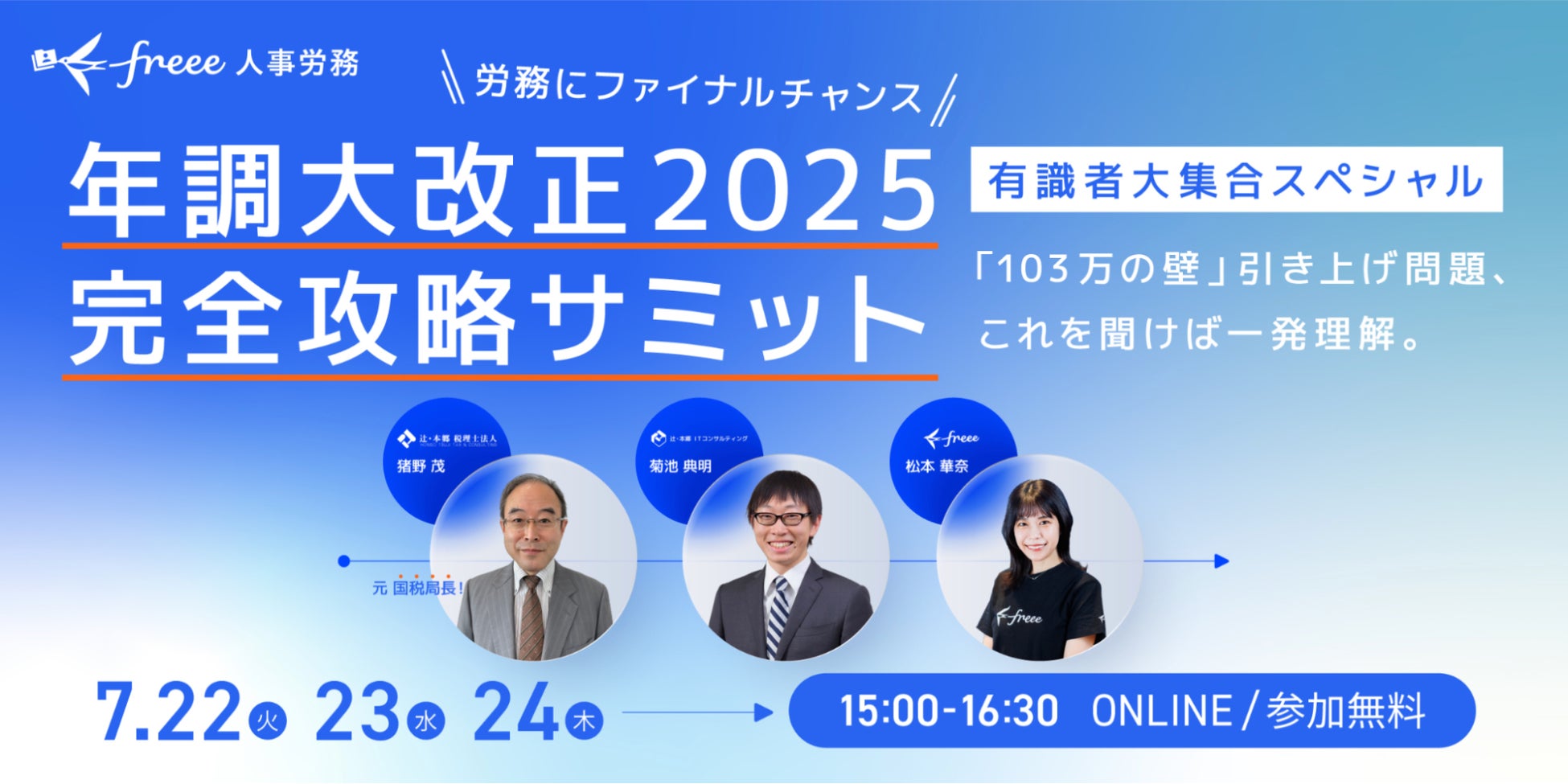 「103万の壁」等の課題や複雑化する年末調整について、元国税局長と税理士が令和7年度の大改正を徹底解説します。また、freee人事労務ユーザーの方をお招きし、年末調整のデジタル化による業務効率化の実例や具体的な変化についてお話しいただきます。