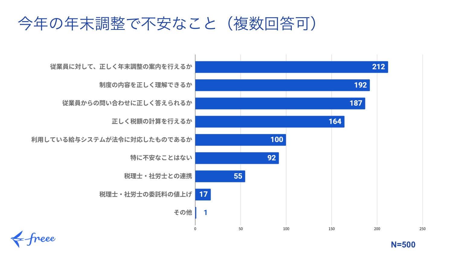 今年の年末調整において不安なこととして、「従業員に対して正しく年末調整の案内を行えるか」「制度の内容を正しく理解できるか」「従業員からの問い合わせに正しく答えられるか」が上位に挙がり、従業員へのコミュニケーション面での不安が目立ちました。