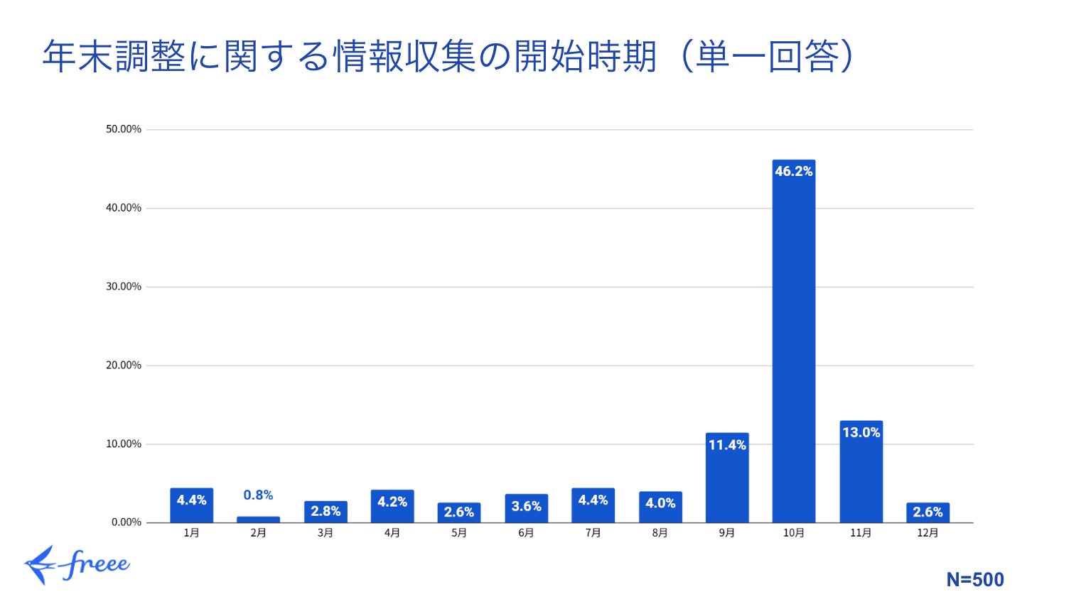 例年、税制改正の法案は、3月末までに国会で審議され、4月1日から施行されます。改正内容について、企業の年末調整業務担当者は例年9月〜10月頃に情報収集を開始し、11月末までに対応を完了するケースが多いです。今年度は、改正の内容が例年よりも複雑であり、年末調整業務の煩雑化が想定されますが、例年通り10月に情報収集を開始すると回答した担当者が5割近くにのぼりました。