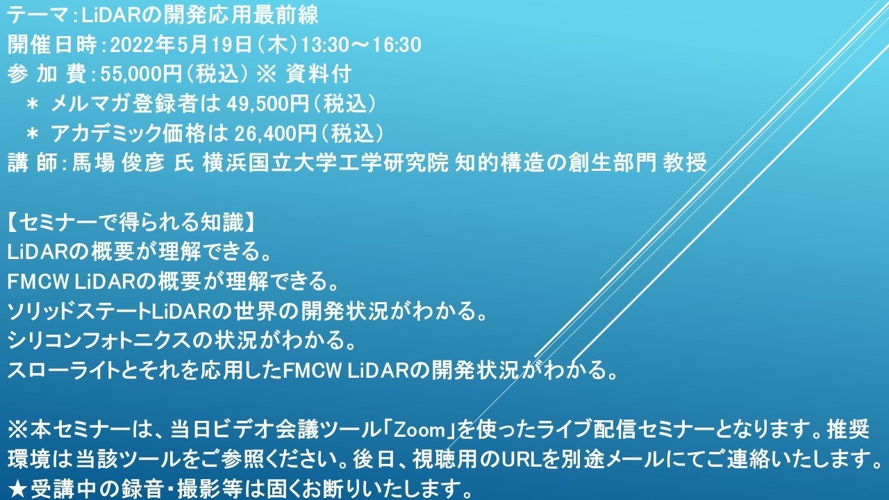先端技術情報や市場情報を提供している(株)シーエムシー・リサーチ(千代田区神田錦町: https://cmcre.com/ )では、 各種材料・化学品などの市場動向・技術動向のセミナーや書籍発行を行っておりますが、 このたび「LiDARの開発応用最前線」と題するセミナーを、 講師に馬場 俊彦 氏 横浜国立大学工学研究院 知的構造の創生部門 教授)をお迎えし、2022年5月19日(木)13:30より、 ZOOMを利用したライブ配信で開催いたします。 受講料は、 一般:55,000円(税込)、 弊社メルマガ会員:49,500円(税込)、 アカデミック価格は26,400円(税込)となっております(資料付)。