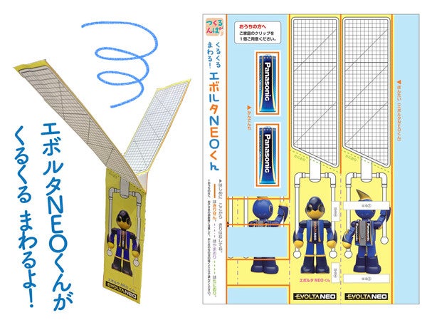 その名も「くるくるまわる! エボルタNEOくん」。指示通りにはさみで切って折り、高いところからパッと手を離すと、エボルタNEOくんがくるくる回りながら降りてくるという楽しい工作です。エボルタNEOくんの背中には、紙製の〝乾電池〟を差す部分もありますよ。