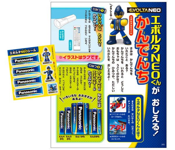 本誌の記事「エボルタNEOくんがおしえる! かんでんち」のページで、乾電池について学びながら、『かんでんちシール』を貼ることで、楽しく乾電池の使い方を体感することができます。