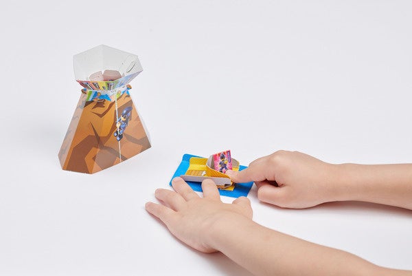 初めに、付属のシートをじゃばら折りにして、本の形をしたケースに貼りつけます。スイッチを入れて開くと……ステキなライトに変身! あたたかな光で周りを照らすのが特徴。シートに色を塗ったり、デコったりすれば、オリジナルライトが作れます。