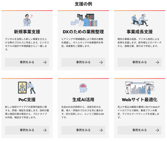 <DXのための業務整理> ヒアリングや現場確認により現状の業務を調査し、ボトルネックや改善箇所を特定。改善案をご提案します。 <PoC支援> 新しい技術やアイデアの実現可能性に関する、評価・検証を支援します。目的の整理と検証計画の策定から、プロトタイプの作成、検証まで伴走します。 <Webサイト最適化> 売上や見込み顧客の獲得に向けたWebサイトのアクセス解析、集客プランの策定、デジタルマーケティングを支援します。