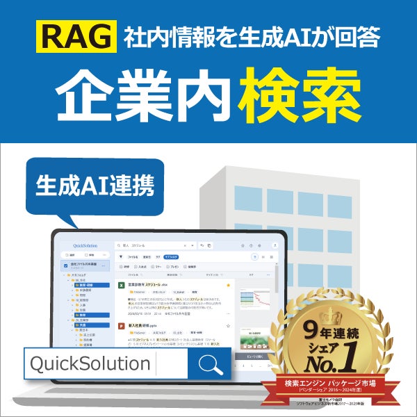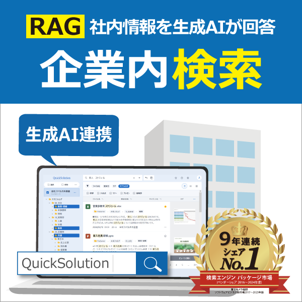 9年連続シェアNo.1*のエンタープライズサーチ!社員の「情報探しの時間」を大幅に短縮! ファイルサーバーやクラウドなどに点在する情報を横断的に、ファイルの中身まで検索できるシステムです。また、生成AI連携(RAG対応)により社内情報から質問応答が可能です。