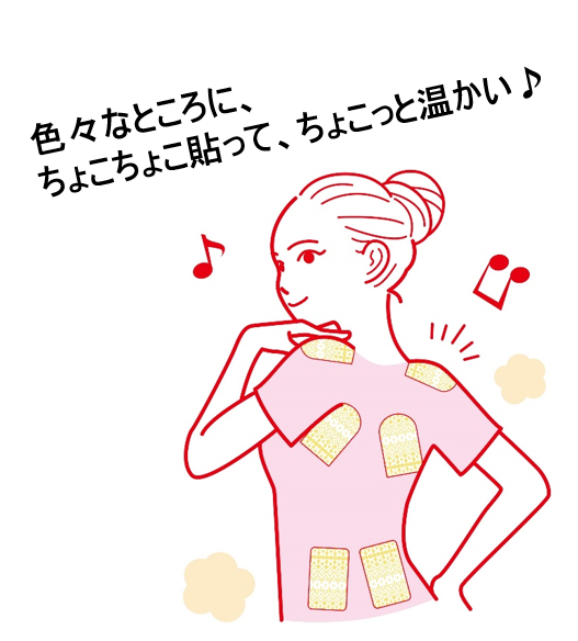 - お客様の声にお応えし、屋内でも使いやすいよう、既存品よりも低い46~47℃のほんわかやさしい温度設計(*2)にしました。(*2)通常品ホカロン貼るミニタイプ(平均温度51℃)との比較