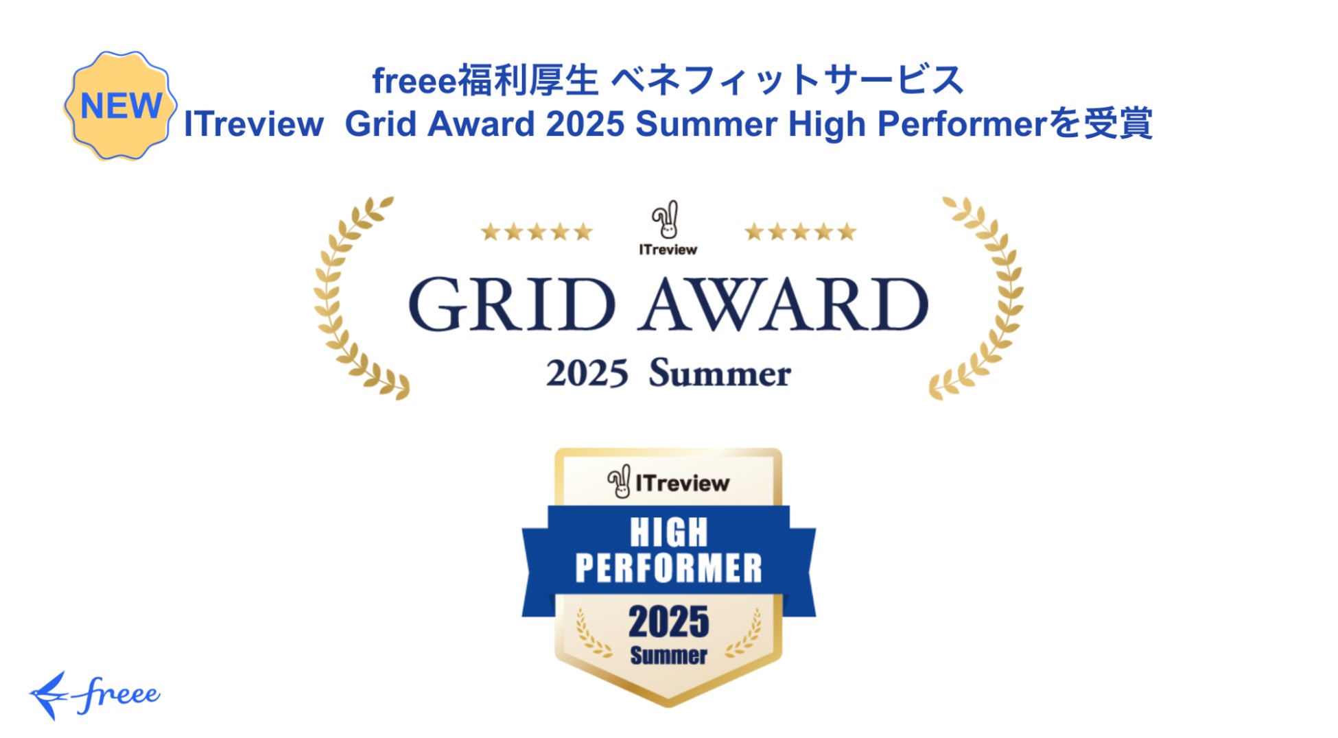 フリー株式会社(本社:東京都品川区、CEO:佐々木大輔、以下「freee」)はアイティクラウド株式会社が主催する「ITreview Grid Award 2025 Summer」の「福利厚生アウトソーシングサービス部門」おいて、freee福利厚生 ベネフィットサービスが「High Performer」を受賞したことをお知らせします。